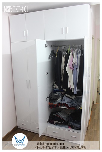Chi tiết đầu tiên được lắp đặt cho phòng ngủ là tủ kịch trần TKT-4.01 màu trắng có kích thước chiều ngang tủ 160cm, chiều cao tủ 260cm và độ sâu tủ là 55cm. Tủ kịch trần TKT-4.01 được làm kết cấu tủ 4 cánh mở - 2 buồng - 4 ngăn kéo ngoài liền tủ kho để đồ phía trên.