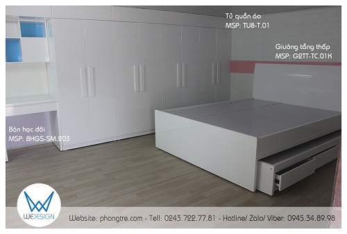 Giường tầng thấp màu trắng của gia đình nhà chị Linh có giường tầng trên là giường 1m6x2m, giường tầng dưới là giường 1mx1m9. Khi tư vấn về kết cấu giường tầng thấp cho cả gia đình, Wedesign tư vấn chị Linh chọn kiểu