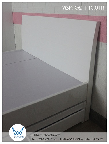 Giường tầng thấp đa năng màu trắng tạo dáng cong, được Wedesign tư vấn chị Linh làm thêm 2 đường soi ngang để tạo điểm nhấn trang trí cho đầu cao giường.
